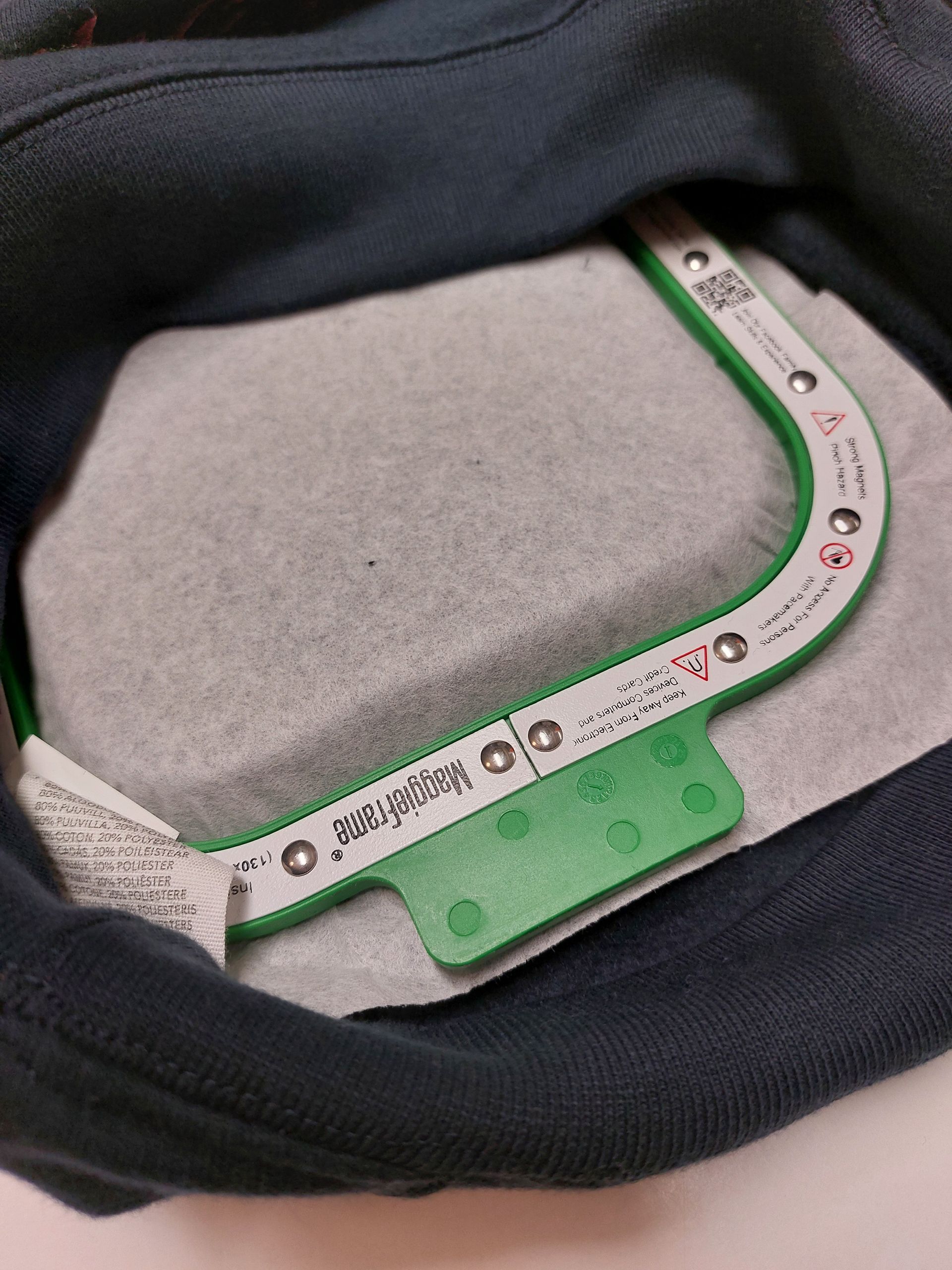 2.1.3 Befestige den Stoff mit dem magnetischen Rahmen. Der Rahmen hält den Stoff sicher an Ort und Stelle, während du arbeitest.