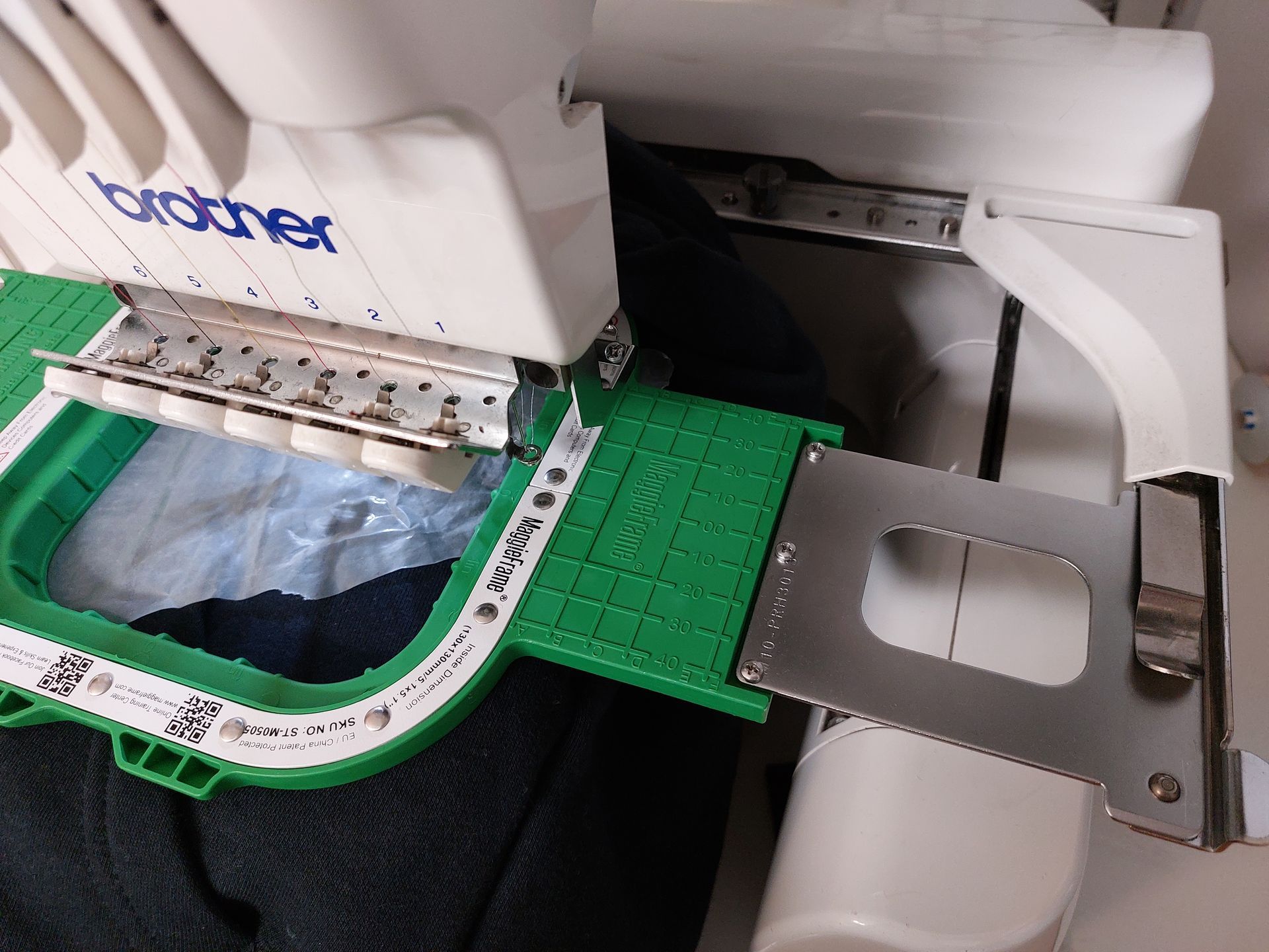 2.1.4 Schiebe den magnetischen Rahmen mit dem eingespannten Stoff in die Stickmaschine. Achte darauf, dass die richtigen Maschinenarme korrekt positioniert sind. Es gibt viele Videos auf YouTube, die den Vorgang Schritt für Schritt zeigen.