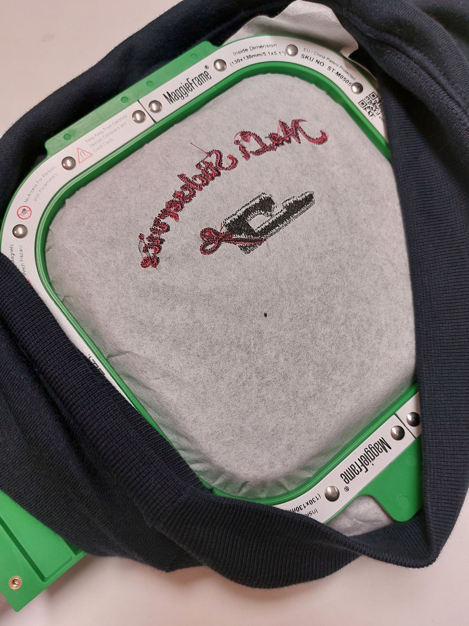 Diese starken Magnetrahmen lassen sich problemlos in fast jede Stickmaschine einsetzen. Es ist nicht notwendig, den äußeren Rahmen anzupassen; der Magnet passt sich automatisch an verschiedene Stoffdicken an. MaggieFrame reduziert Rahmenabdrücke sowie die Belastung der Arme und Handgelenke. Selbst Carhartt-Jacken lassen sich mit MaggieFrame problemlos einspannen. Diese magnetischen Stickrahmen von MaggieFrame sind die neueste Erfindung, patentiert von Sewtech, und haben sich zu einem der beliebtesten Sticksysteme entwickelt. Ihre patentierten Funktionen machen sie zum einfachsten, schnellsten und gleichmäßigsten Einspannsystem auf dem Markt.