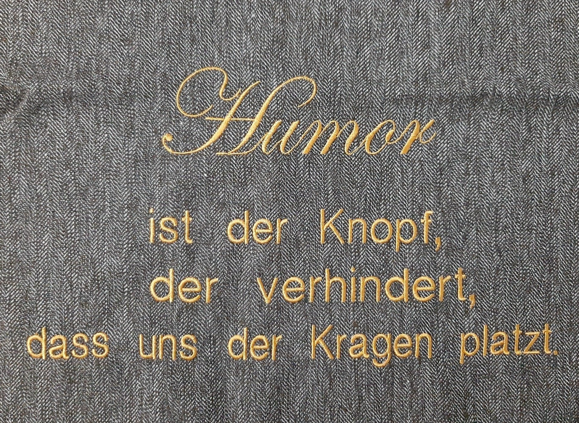 Es gibt Textilien, die sich nicht für eine Bestickung eignen. Gerne vereinbaren wir einen Termin, bei dem SIE mir ein Exemplar mitbringen können, damit ich prüfen kann, ob eine Bestickung dennoch möglich ist. Da dies nicht immer garantiert werden kann, empfehle ich Ihnen, ein Ersatzexemplar bereitzuhalten.